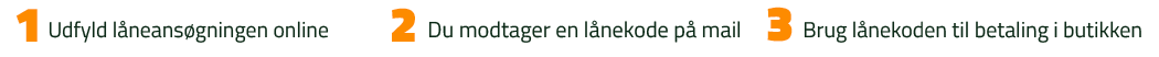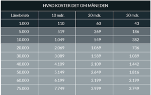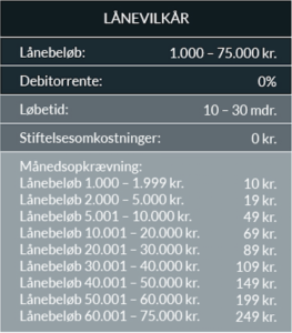 REPRÆSENTATIVT EKSEMPEL: Ved et samlet kreditbeløb på 30.000 kr. over 30 måneder, der tilbagebetales via betalingsservice. Månedlig ydelse: 1.089 kr. Debitorrente 0% (variabel i lånets løbetid). ÅOP: 6,92%. Samlede kreditomk: 2.670 kr. Samlet tilbagebetaling: 32.670 kr. Stiftelsesomkostninger: 0 kr. Månedsopkrævning: 89 kr. FORTRYDELSESRET: Du kan fortryde den indgåede kreditaftale indenfor 14 dage