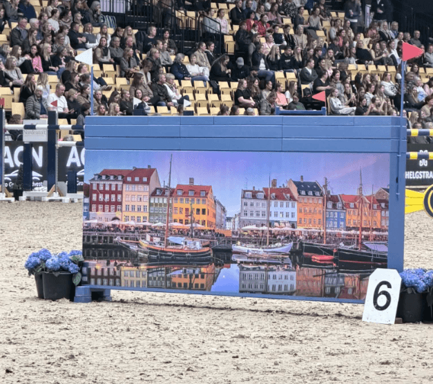 Her er muren fra Dansk Varmblods Hingstekåring 2026. Muren er designet i samarbejde med banebyggerne og havde sin debut netop i Herning.