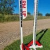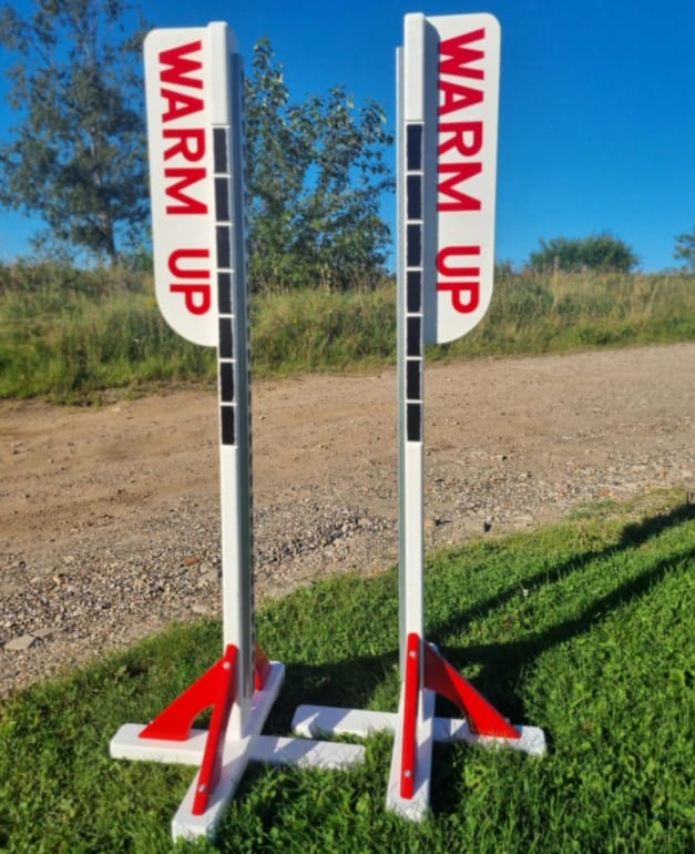 Disse warm up enkeltstøtter er ikke påsat mål men er lavet med markeringer. Støtterne er hvidmalede og med påsat tekst i rødt folie.